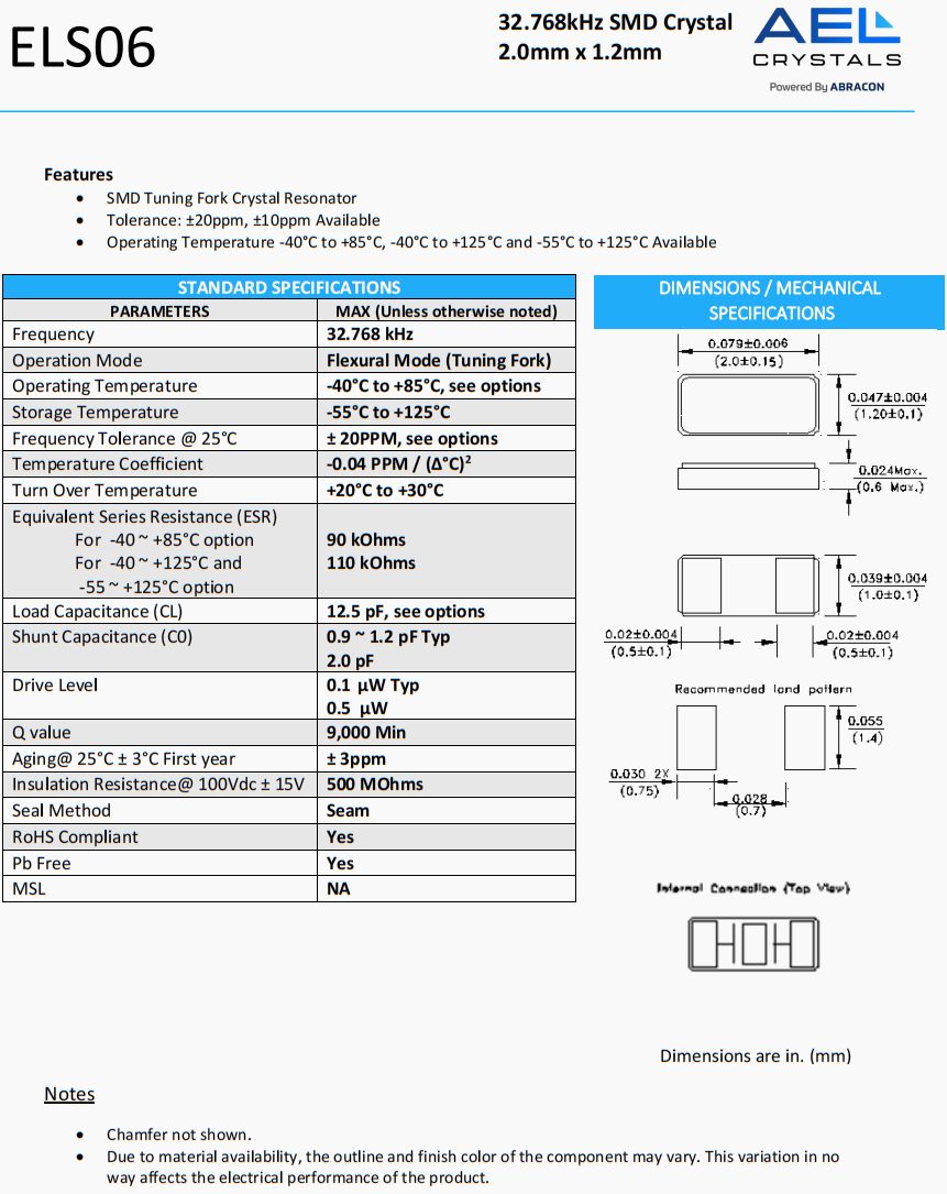 | ELS07-32.768kHz-6-T | AEL Crystals | ELS07 | 32.768 kHz | 0 | ±20ppm | 6 pF |
