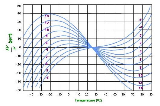 (圖2)是以AT切割角度變動在厚度振動模態(tài)的頻率對溫度特性的展開圖. 圖中以常用的室溫攝式25度作為相對零點, AT切割的最大優(yōu)點是頻率對溫度變化為一元三次方曲線. 這個特性, 從(圖六)中可以看到, 在相當(dāng)寬廣的溫度范圍下, AT切割的溫度曲線的第一階及第二階常數(shù)為零, 第三階的常數(shù)便決定了頻率對溫度的變化值.,