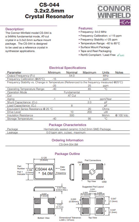 CS-044-054.0M,6G無線網絡晶振,ConnorWinfield進口晶體參數表