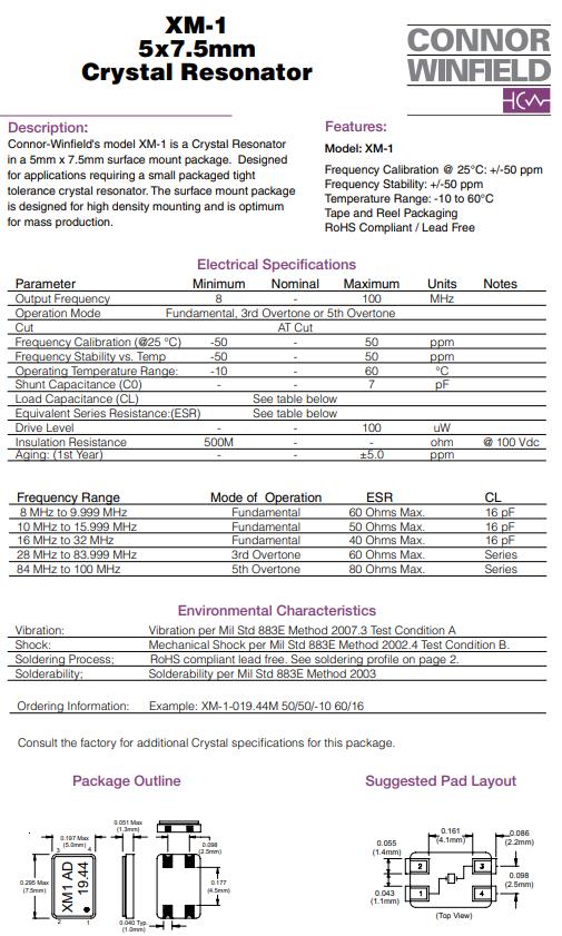 | XM-1-012.0M | Connor-Winfield | XM-1 | 12MHz | ±50ppm | ±50ppm | 16pF | 50 Ohm | -10°C ~ 60°C |