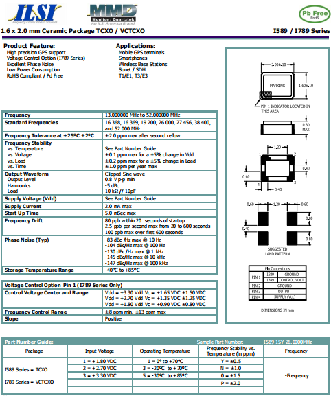 ILSI晶振,I589晶振,TCXO晶振.貼片石英晶振,體積小,焊接可采用自動(dòng)貼片系統(tǒng),產(chǎn)品本身小型,表面貼片晶振,特別適用于有小型化要求的電子數(shù)碼產(chǎn)品市場(chǎng)領(lǐng)域,因產(chǎn)品小型,薄型優(yōu)勢(shì),耐環(huán)境特性,包括耐高溫,耐沖擊性等,在移動(dòng)通信領(lǐng)域得到了廣泛的應(yīng)用,晶振產(chǎn)品本身可發(fā)揮優(yōu)良的電氣特性,滿足無鉛焊接的高溫回流溫度曲線要求.