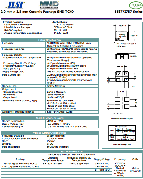 ILSI晶振,I787晶振,VC-TCXO晶振.具有最適合于移動(dòng)通信設(shè)備用途的高穩(wěn)定的頻率溫度特性.為對(duì)應(yīng)低電源電壓的產(chǎn)品.(可對(duì)應(yīng)DC +1.8 V±0.1 V to +3.2 V±0.1 V )高度:最高1.0 mm,體積:0.007 cm3,重量:0.024g,超小型,輕型.低消耗電流,表面貼片型產(chǎn)品.(可對(duì)應(yīng)回流焊) 無(wú)鉛產(chǎn)品.滿足無(wú)鉛焊接的回流溫度曲線要求.