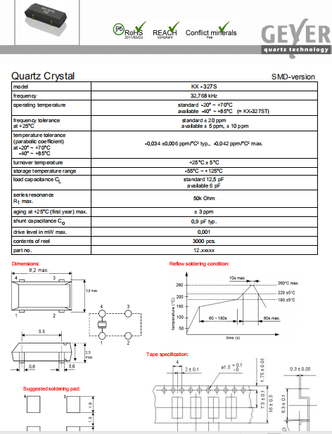 Geyer晶振,KX-327S晶振,無鉛環(huán)保晶振.超小型,薄型,質(zhì)地輕的表面貼片音叉型石英晶體諧振器,手機晶體,產(chǎn)品體積小,特別適用于各種小巧的便攜式消費電子數(shù)碼產(chǎn)品,在移動通信領(lǐng)域得到了廣泛的應(yīng)用,晶振產(chǎn)品本身可發(fā)揮優(yōu)良的電氣特性,滿足無鉛焊接的高溫回流溫度曲線要求.