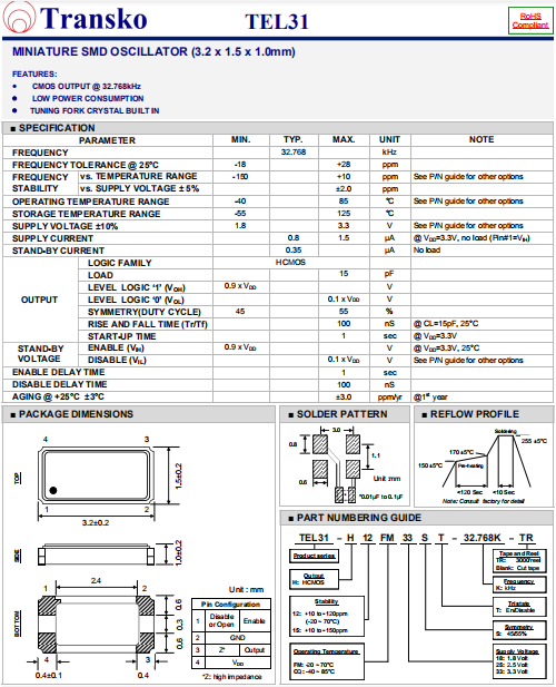 Transko晶振,TEL31晶振,時鐘晶體振蕩器.小體積SMD時鐘晶體振蕩器,是貼片音叉晶體,千赫頻率元件,應(yīng)用于時鐘模塊,智能手機(jī),全球定位系統(tǒng),因產(chǎn)品本身體積小,SMD編帶型,可應(yīng)用于高性能自動貼片焊接,被廣泛應(yīng)用到各種小巧的便攜式消費電子數(shù)碼時間產(chǎn)品,環(huán)保性能符合ROHS/無鉛標(biāo)準(zhǔn).