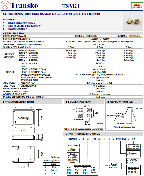 Transko晶振,TSM21晶振,低抖動(dòng)石英振蕩器.智能手機(jī)晶振,產(chǎn)品具有高精度超小型的表面貼片型石英晶體振蕩器,最適用于移動(dòng)通信終端的基準(zhǔn)時(shí)鐘等移動(dòng)通信領(lǐng)域.比如智能手機(jī),無(wú)線通信,衛(wèi)星導(dǎo)航,平臺(tái)基站等較高端的數(shù)碼產(chǎn)品,晶振本身小型,薄型具備各類(lèi)移動(dòng)通信的基準(zhǔn)時(shí)鐘源用頻率,貼片晶振具有優(yōu)良的電氣特性,耐環(huán)境性能適用于移動(dòng)通信領(lǐng)域,滿足無(wú)鉛焊接的高溫回流溫度曲線要求.