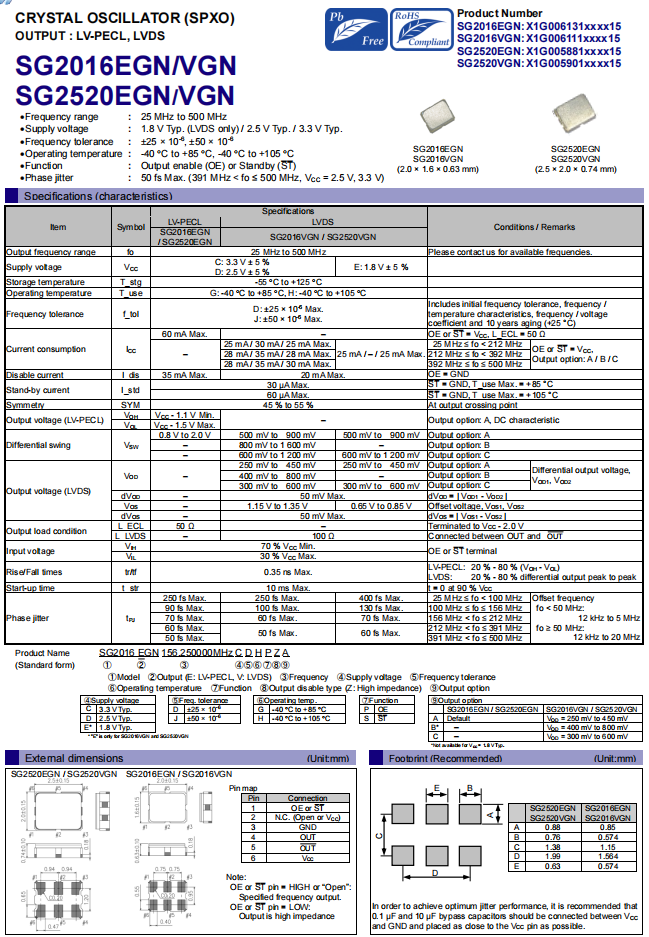 | X1G0059010004 | SG2520VGN | 156.250000 MHz | 2.50 x 2.00 x 0.84 mm | LVDS | 3.135 to 3.465 V | -40 to 105 °C |