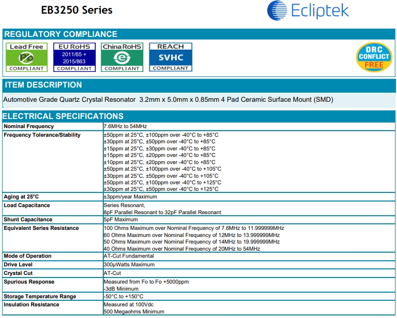 | Ecliptek晶振 | 單位 | EB3250晶振 | 石英晶振基本條件 |