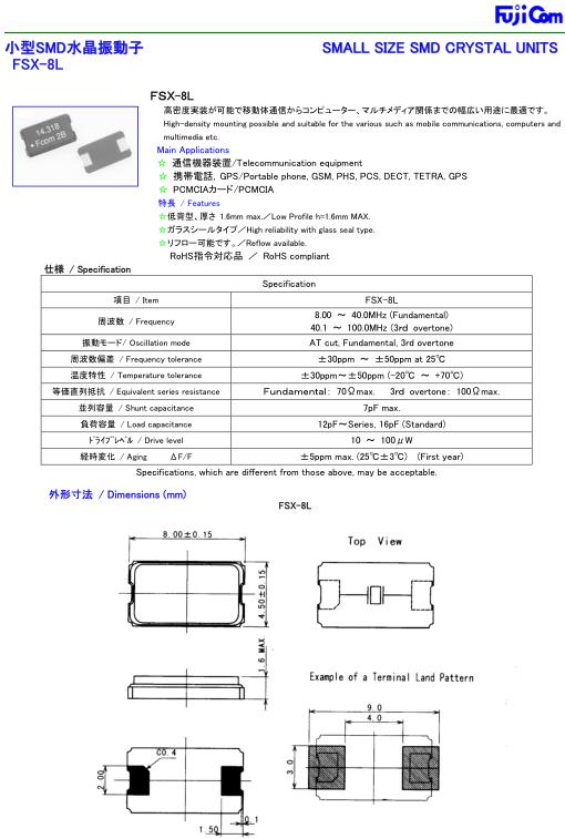 Fujicom富士晶振,FSX-8L兩腳貼片晶振,8045mm無源晶振,貼片石英晶振最適合用于車載電子領域的小型表面貼片石英晶體振蕩器.也可對應有高可靠性要求的引擎控制用CPU的時鐘部分簡稱為時鐘晶體振蕩器,在極端嚴酷的環境條件下也能發揮穩定的起振特性,產品本身具有耐熱,耐振,耐撞擊等優良的耐環境特性,滿足無鉛焊接的回流溫度曲線要求,符合AEC-Q200標準.