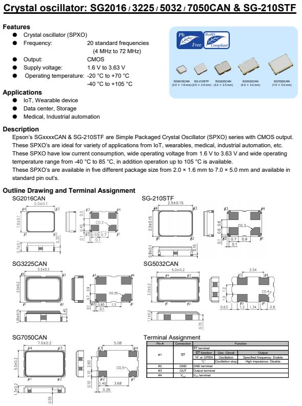 愛普生的SGxxxxCAN和SG-210STF是具有CMOS輸出的簡單封裝晶體振蕩器(SPXO)系列。這些SPXO是物聯(lián)網(wǎng)、可穿戴設備、醫(yī)療、工業(yè)自動化等各種應用的理想選擇。這些SPXO有源晶振具有低電流消耗,寬工作電壓從1.6 V到3.63 V,寬工作溫度范圍從-40°C到85°C,另外可操作到105°C。這些SPXO的可在五種不同的包裝尺寸從2.0 × 1.6毫米到7.0 × 5.0毫米,可在標準針的。