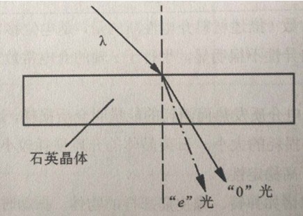 石英晶體也與其它一些物質(如方解石CaCO3、硝酸鈉NaNO3晶體等)那樣具有雙折射現象,即一束光射入石英晶體時,分裂成兩束沿不同方向傳拓的光其中一束光遵循折射定律,叫做尋常光或稱“0”光,另一束光不遵循折射定律,叫做非尋常光,又稱“e”光,如圖1.3.1所示,尋常光在石英晶體內部各個方向上的折射率mo是相等的,而非尋常光在石英晶體的內部各個方向的折射率n0卻是不相等的。例如:對于波長為5893A的光,石英晶體的n0=1.54425,最大的ne=1.5536。石英晶體雖然具有雙折射現象,但當光沿z軸方向入射時,不發生雙折射現象,所以又稱z軸為光軸