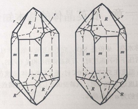 在結(jié)晶學(xué)中,石英晶體諧振器內(nèi)部結(jié)構(gòu)可以概括為是由一些“點子”在空間有規(guī)則地作周期的無限分布:“點子”代表原子、離子、分子或其集團的重心。這些“點子”的總體稱為點陣,構(gòu)成石英晶體的是二氧化硅分子,而二氧化硅分子的重心又正好與硅離子重合,因此硅離子的點陣就可以反映出石英晶體的內(nèi)部結(jié)構(gòu)。石英晶體的各層硅離子若按右手螺旋規(guī)則分布,則稱為右旋石英晶體;若按左手螺旋規(guī)則分布,稱為左旋石英晶體。從外形上看,右旋石英晶體的s面在R面的右下方或m面的左上方,左旋石英晶體的s面在R面的左下方或m面的右上方(見圖1.1.1),它們互為鏡象對稱。