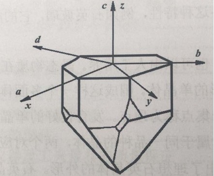 晶體物理性質(zhì)的各向異性和晶體外形的對稱性有關(guān),因此討論石英晶體的物理性質(zhì)時,采用為圖1.1.2所示的直角坐標系較為方便。選c軸為z軸,a(或b、d)軸為x軸,與x軸、z軸垂直的軸為y軸。其指向按1949年IRE標準規(guī)定對左、右旋石英晶體均采用右手直角坐標系。