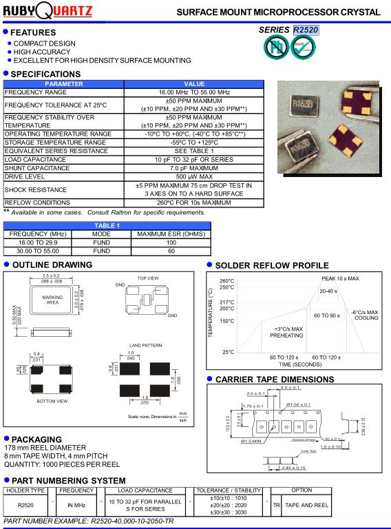 所有石英晶體諧振器和實時時鐘模塊都以IC形式提供.Rubyquartz盧柏晶振,R2520無源晶體,R2520-26.000-10-2050-TR晶振.