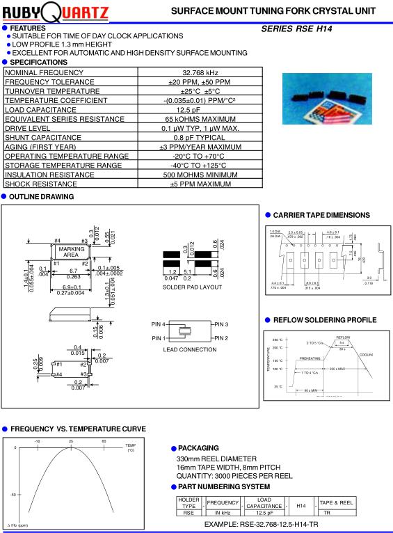 Rubyquartz晶振,RSE-H14貼片諧振器,RSE-32.768-12.5-H14-TR音叉晶體,32.768KHz時(shí)鐘晶體具有小型,薄型,輕型的貼片晶振表面音叉型晶體振蕩器,產(chǎn)品具有優(yōu)良的耐熱性,耐環(huán)境特性,可發(fā)揮晶振優(yōu)良的電氣特性,符合RoHS規(guī)定,滿(mǎn)足無(wú)鉛焊接的高溫回流溫度曲線要求,金屬外殼的封裝使得產(chǎn)品在封裝時(shí)能發(fā)揮比陶瓷振蕩器外殼更好的耐沖擊性.