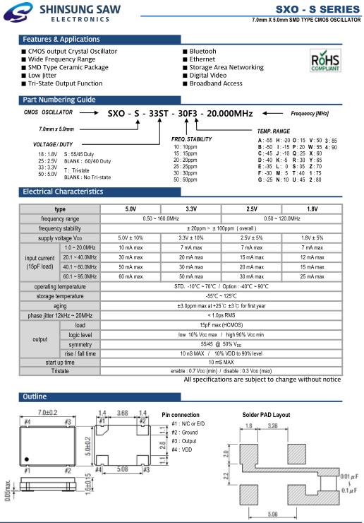 新松晶振,SXO-S藍牙有源晶振,SXO-S-33ST-30F3-20.000MHz晶振,小型SMD有源晶振,從最初超大體積到現(xiàn)在的7050mm,6035mm,5032mm,3225mm,2520mm體積,有著翻天覆地的改變,體積的變小也使產(chǎn)品帶來了更高的穩(wěn)定性能,接縫密封石英晶體振蕩器,精度高,覆蓋頻率范圍寬的特點,SMD高速自動安裝和高溫回流焊設(shè)計,Optionable待機輸出三態(tài)輸出功能,電源電壓范圍:1.8V~5V,高穩(wěn)定性,低抖動,低功耗,主要應(yīng)用領(lǐng)域:無線通訊,高端智能手機,平板筆記本W(wǎng)LAN,藍牙,數(shù)碼相機,DSL和其他IT產(chǎn)品的晶振應(yīng)用,三態(tài)功能,PC和LCDM等高端數(shù)碼領(lǐng)域,符合RoHS/無鉛.