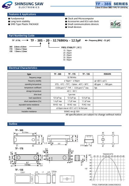 韓國(guó)新松晶振,TF-38S貼片晶振,TF-38S-25-32.768KHz-12.5pF晶振,32.768K時(shí)鐘晶體具有小型,薄型,輕型的貼片晶振表面音叉型晶體振蕩器,產(chǎn)品具有優(yōu)良的耐熱性,耐環(huán)境特性,可發(fā)揮晶振優(yōu)良的電氣特性,符合RoHS規(guī)定,滿足無鉛焊接的高溫回流溫度曲線要求,金屬外殼的封裝使得產(chǎn)品在封裝時(shí)能發(fā)揮比陶瓷振蕩器外殼更好的耐沖擊性.