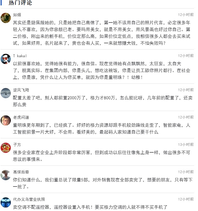 根據(jù)格力官方銷(xiāo)售平臺(tái)顯示,目前只賣(mài)出5臺(tái),這款手機(jī)據(jù)說(shuō)是董明珠親自代言做廣告,手機(jī)開(kāi)機(jī)畫(huà)面即為董明珠本人,希望能讓國(guó)人愛(ài)上中國(guó)制造。這銷(xiāo)量可真是震驚了整個(gè)手機(jī)界。之前董明珠大膽放言:“華為賣(mài)老大,我就賣(mài)老二嘛。”但是,理想很美好,現(xiàn)實(shí)卻很殘酷。董明珠的豪言與現(xiàn)在目前銷(xiāo)量上很不符合,由此,各種聲音此起彼伏“董大媽對(duì)于這你真不怕被打臉么?”借助網(wǎng)友的話,"那個(gè)開(kāi)機(jī)畫(huà)面,實(shí)在是看著心累,董大媽太搶鏡。""建議董大媽不要再折騰做手機(jī)了,好好做格力空調(diào)吧,把空調(diào)質(zhì)量再進(jìn)一步的完美"等等之類(lèi)的話,可讓網(wǎng)友們操碎了心,我們來(lái)看看網(wǎng)友的一些評(píng)論,此評(píng)論來(lái)源由騰訊網(wǎng):