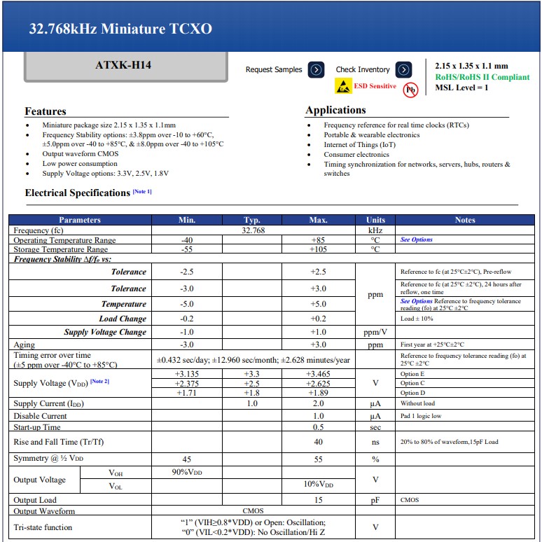 | ATXK-H14 | kHz TCXO | 2.15 x 1.36 | 32.768 kHz | 3.3V、2.5V、1.8V | 3.8 / 5.0 / 8.0 |