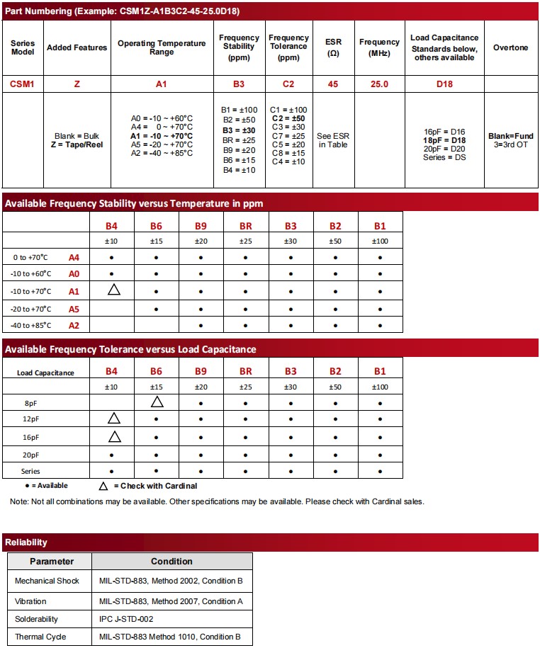 | CSM1Z-A5B2C3-200-4.0D18 | Cardinal晶振 | CSM1 | MHz Crystal | 4MHz |
