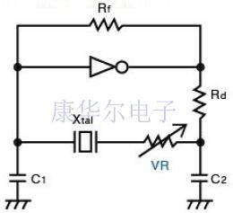 為了確認振蕩電路的振蕩余量是否足夠,需要知道振蕩電路的負電阻(-R).插入與晶振單元串聯的可變電阻器(VR),并從振蕩停止狀態更改到振蕩開始為止的值.振蕩開始時的VR值變為負電阻值(-R).為了獲得足夠的振蕩電路的振蕩余量,請調整C1,C2和Rd,以使負電阻值至少為石英晶體振蕩器單元有效電阻值的5倍.此外,當用于車載等高度可靠的設備時,建議使用10次以上.