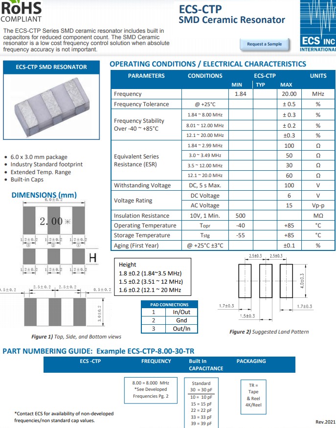 更多>>ECS-CTP-2.00-15-TR陶瓷諧振器是一種低成本的頻率控制解決方案