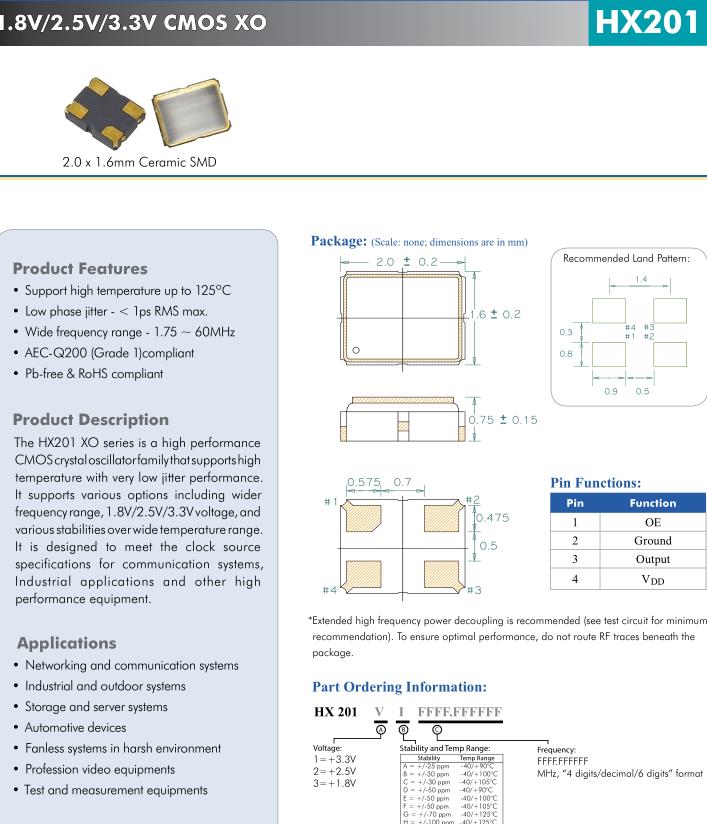 HX201 XO系列是高性能的CMOS時鐘晶體振蕩器家族,支持具有極低抖動性能的高溫度。它支持各種選項,包括更廣泛頻率范圍,1.8V/2.5V/3.3V電壓,和在較寬的溫度范圍內具有多種穩定性。它是為滿足時鐘源而設計的通信系統規范,工業應用等較高設備性能。