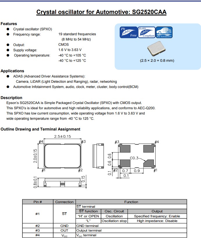 愛普生晶振SG2520CAA是一款具有CMOS輸出的簡單封裝石英晶體振蕩器(SPXO),小體積尺寸2.5x2.0mm四腳貼片晶振,有源晶振,頻率范圍:8MHz至54MHz,1.6V至3.63V的寬工作電壓以及寬工作溫度范圍-40℃至+105℃/+125℃,該產品具有超小型,輕薄型,低電流消耗,耐高溫晶振,耐熱、耐振、耐沖擊等優良的耐環境特性,滿足無鉛焊接的高溫回流溫度曲線要求,符合AEC-Q200標準,非常適用于汽車和高可靠性應用,ADAS(高級駕駛輔助系統): 攝像頭、激光雷達(光探測和測距)、雷達、網絡,汽車信息娛樂系統、音頻、時鐘、儀表、組合儀表、車身控制(BCM)等。