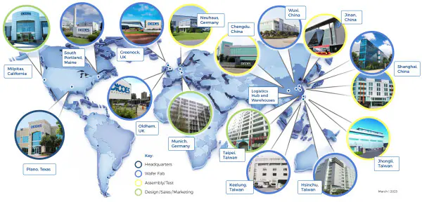 Diodes 公司總部及美洲銷(xiāo)售辦公室位于美國(guó)德州普拉諾 (Plano) 與加州米爾皮塔斯 (Milpitas)。設(shè)計(jì)、營(yíng)銷(xiāo)與工程中心位于普拉諾、米爾皮塔斯、臺(tái)北、桃園、竹北、上海、揚(yáng)州、英國(guó)奧爾德姆及德國(guó)紐豪斯 。Diodes 的晶圓生產(chǎn)設(shè)施位于美國(guó)緬因州南波特蘭;英國(guó)格林諾克奧爾德姆;中國(guó)上海和無(wú)錫;還有基隆和新竹。Diodes 在中國(guó)上海、濟(jì)南、成都、無(wú)錫、中壢和基隆以及德國(guó)紐豪斯設(shè)有組裝與測(cè)試設(shè)施。另外在多個(gè)據(jù)點(diǎn)設(shè)有工程、銷(xiāo)售、倉(cāng)儲(chǔ)及物流辦公室,包括臺(tái)北、香港、上海、深圳、武漢、揚(yáng)州;英國(guó)奧爾德姆;南韓城南市以及德國(guó)慕尼黑、法蘭克福,并于世界各地設(shè)有支持辦公室。