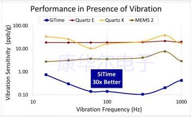 振動靈敏度或g靈敏度(以ppb/g表示)表示由加速力引起的頻率變化.圖1繪制了以ppb/g為單位的正弦振動引起的噪聲雜散,以證明與基于石英的振蕩器相比,SiTimeMEMS振蕩器在不同頻率下的振動靈敏度較低. 此外,SiTime振蕩器在1.5x0.8mm的小型封裝(kHz振蕩器)和2.0x1.6QFN和SOT23-5小型封裝(MHz振蕩器)中提供0.1ppb/g的性能.石英設(shè)備必須使用大型專用包裝才能實現(xiàn)較低的g敏感度.