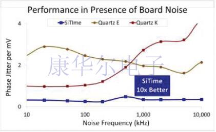 系統(tǒng)中的電源可能是不利于系統(tǒng)性能的主要噪聲源,并且在打開和關(guān)閉電源時會放大此噪聲.大部分噪聲可以通過無源濾波器和去耦電容器濾除.但是,仍然存在一些噪聲,電路板問題(例如接地反彈)會對時鐘抖動產(chǎn)生負面影響.電源噪聲靈敏度(PSNS)是模擬電路設(shè)計中使用的參數(shù),它指示電路對電源噪聲的魯棒性.測試結(jié)果表明,SiTime振蕩器的PSNS比石英器件好得多,包括設(shè)計用于滿足高頻,低抖動要求的石英表面聲波(SAW)振蕩器.