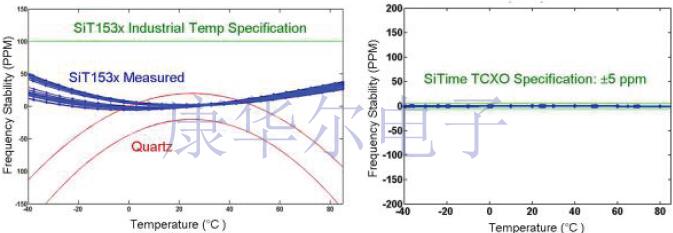 圖4a顯示了基于SiT1532MEMS的32.768kHz振蕩器的頻率穩(wěn)定性與溫度特性曲線.工業(yè)虛線(<100PPMp-p)的SiT1532規(guī)格限制以藍色虛線表示.紅色曲線顯示了使用基于石英的XTAL音叉類型的32.768kHz振蕩器的典型規(guī)格極限.圖4b顯示了基于SiT1552MEMS的TCXO(溫度補償振蕩器)的頻率穩(wěn)定性,該器件已在多個頻率點上進行了出廠校準(微調(diào)),以確保在整個溫度范圍內(nèi)具有極高的穩(wěn)定性.